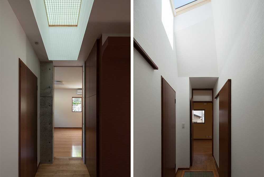 斜面に建っていますので、2階の高さから南側を見ると眺望が開けます。ですので、遠くまで見渡せる景色を毎日見ながら生活できたら気持ちいいだろうな~と思い、リビングを2階に配置しています。1階には、駐輪場や車2台分のインナーガレージがあり、敷地の広さを考えると広いリビングを1階に配置することが難しかったという理由もあり、2階にリビングを配置しています。このリビングの外には、とっても広いバルコニーを設けており、テーブルを出してバーベキューをしたり、ビニールプールで遊んだりと、屋外リビングとして生活を楽しめる空間になればと考えました。この場所から夕日を見ながらの、ゆったりした時間は格別だと思います。基本的な生活は、2階で完結するような間取りにしていますので、2階リビングであってもほとんど支障はありません。北側には、2階から直接道路に出れる勝手口もありますのでゴミ出しも問題なしです。また、いつもの事ですが、家の中にはできるだけ暗い所を作りたくないと思っていますので、北側屋根にはトップライトを設けています。空から差し込む光が2階床を透化して1階まで差し込む様は、とってもきれいです。この光で1階奥のスペースも暗くありません。