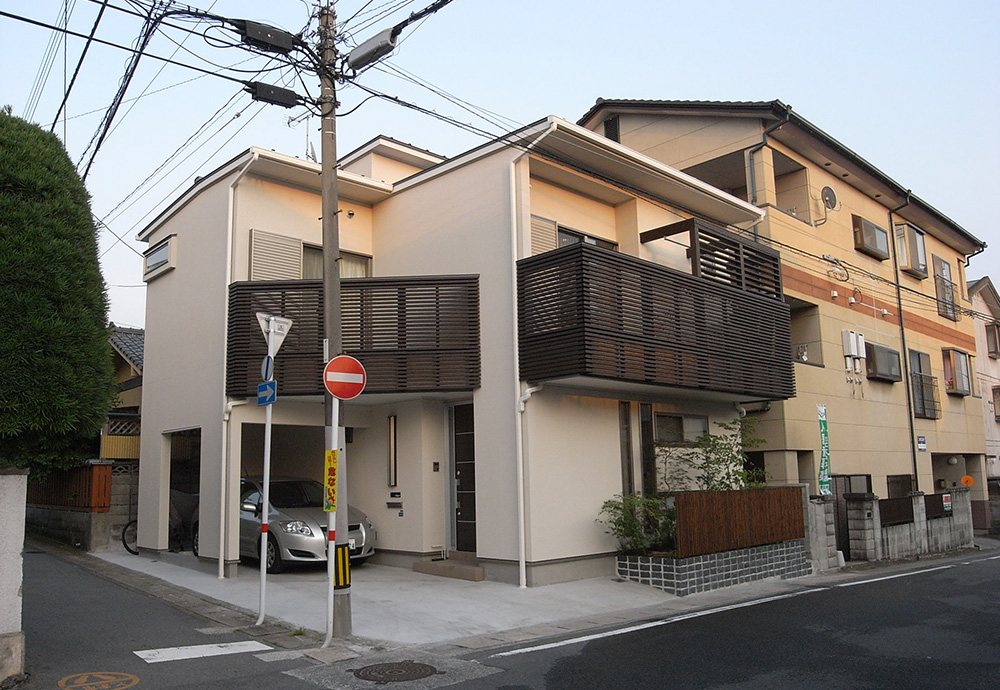 計画地は、南側に3階建てのアパート、東側に2階建ての住宅が接近して建っている日当りの良くない土地。しかも、敷地面積が約27坪という、けして広くはない土地でした。この場所に、駐車場2台分と家族3人が暮らす、明るい住宅が求められました。
